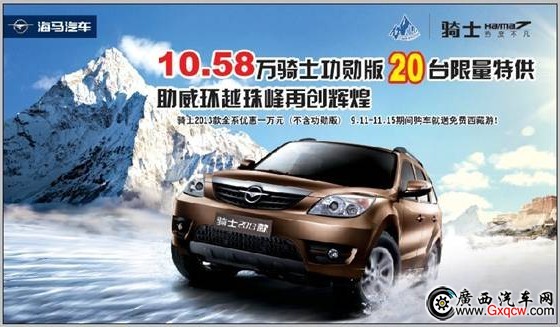 (廣西汽車網(wǎng) 訊)近日,小編從海馬?4S店了解到,于11月3日-4日的在南寧香格里拉廣場舉辦超值汽車團購會,海馬?4S店在14周年店慶之際,真情回饋廣大海馬汽車的新老客戶,用最實惠的價格,給客戶最大的優(yōu)惠。2013款騎士全系優(yōu)惠1萬元,普力馬最高優(yōu)惠1萬元,丘比特最高優(yōu)惠9千,海福星最高優(yōu)惠7千。各種優(yōu)惠送不停,訂車的客戶更可獲贈精美禮品一份。詳情請咨詢13978626283,13978628383。