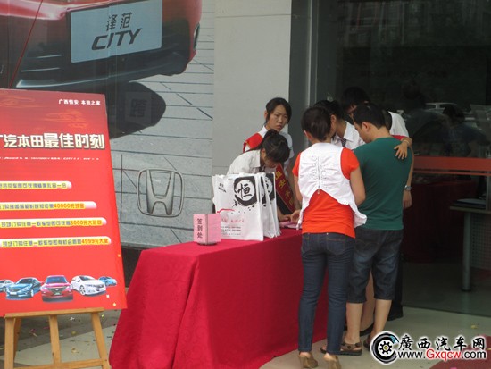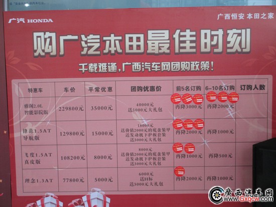 (廣西汽車網(wǎng) 訊)由廣西汽車網(wǎng)聯(lián)合南寧廣緣恒安本田4S店舉辦的“千載難逢 廣汽本田團(tuán)購賞車會(huì)”10月27日在廣緣恒安本田4S店圓滿落幕,此次活動(dòng)是2012年廣汽本田最后一場團(tuán)購活動(dòng),本次活動(dòng)讓許多沒有趕上10月車展的車友買到了心儀的座駕。由召集網(wǎng)友到團(tuán)購當(dāng)天一共有48位網(wǎng)友報(bào)名參加,團(tuán)購原本定在下午兩點(diǎn)準(zhǔn)時(shí)開始,但是許多外地網(wǎng)友早上就已經(jīng)到店看車訂車了,因?yàn)閳F(tuán)購政策比平常政策要多出3000-5000元左右,比之前的車展優(yōu)惠還要大。所以來參加團(tuán)購的網(wǎng)友大部份成功選定自己的愛車。經(jīng)過一天的忙碌,截止下午5點(diǎn)半,團(tuán)購成功簽訂18臺(tái)。廣西汽車網(wǎng)在此感謝大家對(duì)廣西汽車網(wǎng)的支持,因?yàn)槟銈兊膮⑴c讓我們感受到團(tuán)購的力量,也讓我們對(duì)下一站長安鈴木團(tuán)購充滿信心。