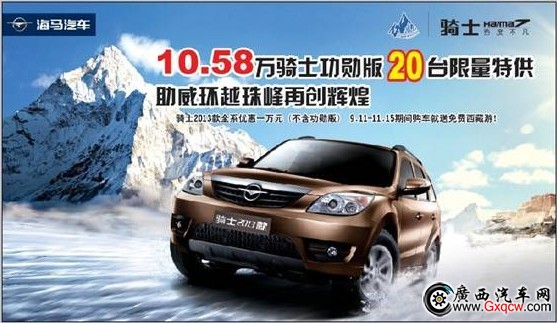 近日,小編從海馬?4S店了解到,于11月3日-4日的在南寧香格里拉廣場舉辦超值汽車團(tuán)購會,3日晚上更有2013款騎士上市發(fā)布團(tuán)購?fù)頃,到場的客戶可觀看激情的熱舞表演,參與團(tuán)購?fù)頃の痘有∮螒蚓湍塬@贈精美小禮品一份,如此誘人的晚會你還在等什么?海馬海康超值汽車團(tuán)購會我們不見不散!