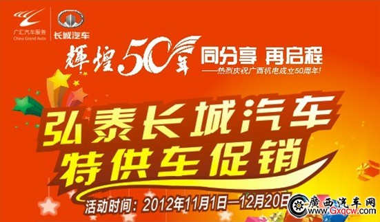 2012年11月1日-12月20日,輝煌50年,同分享,再啟程,廣匯廣西弘泰50臺特供車促銷,50天限時搶購!到廣西弘泰購買特供車,可享以下優(yōu)惠: