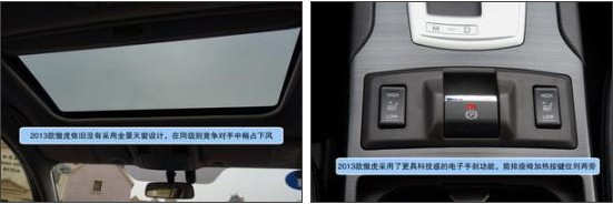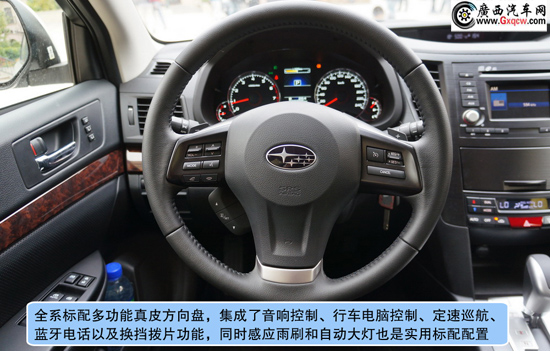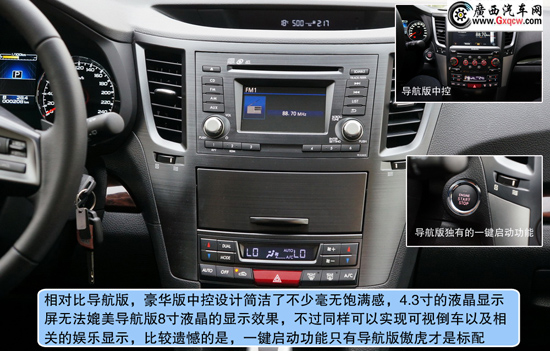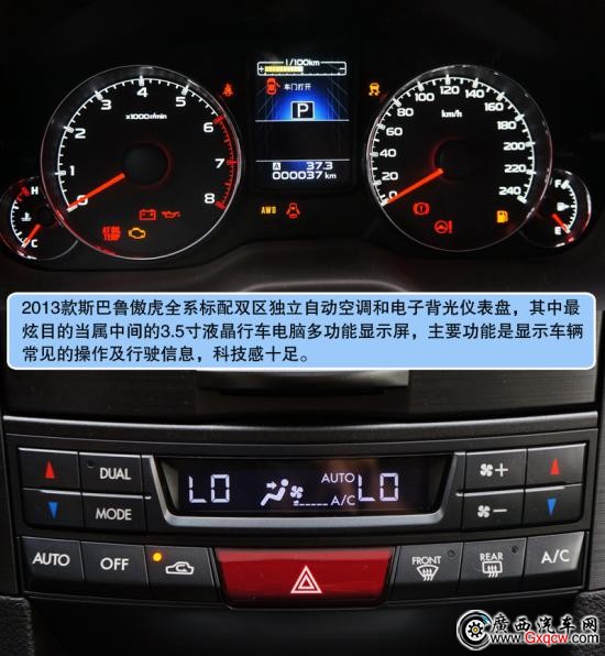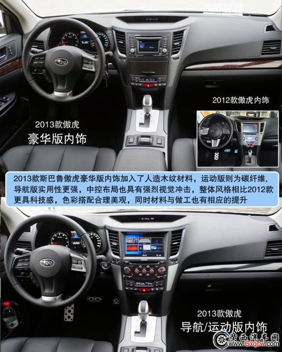 2013款斯巴魯傲虎2.5L豪華版——中控:全新2013款傲虎在內(nèi)飾上讓我們看到了不同之處,電子背光儀表盤/彩色液晶指示器/電子手剎功能,無時無刻不彰顯科技感,豪華版的木紋人造材料絲毫沒有讓人感到反感,相反隱約的透漏一絲尊貴,當(dāng)然,我們還可以選擇運動版的碳纖維的裝飾;對比來看我們會發(fā)現(xiàn)售價31.48萬的導(dǎo)航版提供了智能鑰匙系統(tǒng)、更先進的娛樂系統(tǒng)和更加飽滿豐富的中控布局,價格僅相差1萬5左右并不離譜,唯一遺憾的是全系并不提供全景天窗。