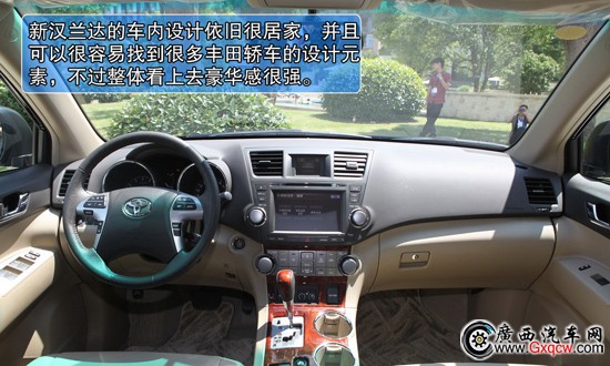 2012款豐田漢蘭達2.7L兩驅(qū)7座豪華版——中控:與健碩的外觀不同,漢蘭達的車內(nèi)設(shè)計依舊很居家,并且可以很容易找到很多豐田轎車的設(shè)計元素,不過整體看上去豪華感很強。與老款車型相比,變化同樣很小,較大尺寸的方向盤依舊為四輻式,只是多功能按鍵的位置發(fā)生了變化。自發(fā)光的儀表盤讀數(shù)很清晰,而紅色標(biāo)線又帶來了少許的運動元,而中控按鍵排列合理,并沒有由此產(chǎn)生松散感,較大的按鍵及旋鈕的手感也很出色,非常易操作。