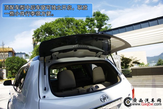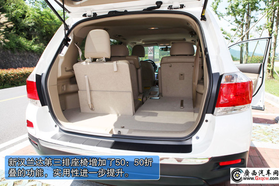 2012款豐田漢蘭達2.7L兩驅(qū)7座豪華版——后備箱:第三排座椅增加了50:50折疊的功能,讓后備箱實用性進一步提升。這也是漢蘭達7座版的優(yōu)化之處,后窗獨立開啟功能,也是比較罕見實用的SUV功能。