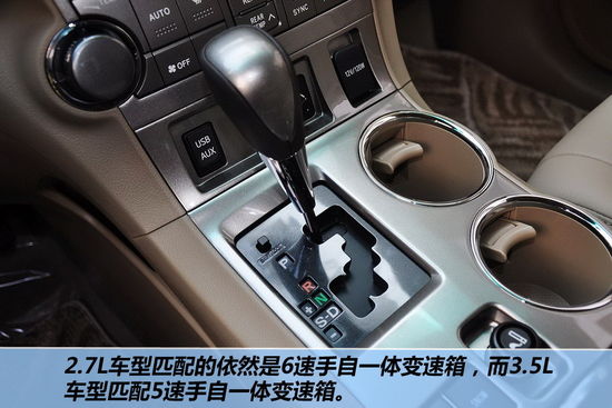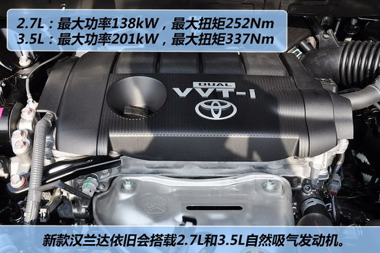 2012款豐田漢蘭達2.7L兩驅7座豪華版——動力/懸掛:新款漢蘭達依舊會搭載2.7L和3.5L自然吸氣發(fā)動機,其中2.7L車型最大功率138kW,最大扭矩252Nm,2.7L車型匹配的依然是6速手自一體變速箱,而3.5L車型匹配5速手自一體變速箱。底盤懸掛結構沒有改變與凱美瑞一樣,即前麥弗遜后雙連桿,越野性能很一般,注重舒適性。