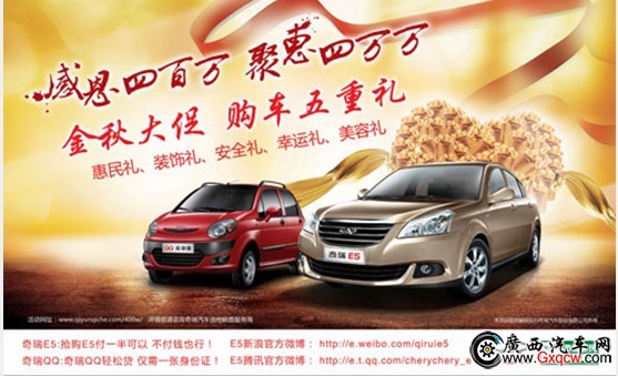 活動期間,消費者購買奇瑞E5(新悅型除外)、旗云2、旗云3,可暢享奇瑞汽車金秋好禮——3000元“惠民禮”、4000元超值“裝飾禮”及安駕儀“安全禮” “幸運禮”、“美容禮”;購買奇瑞QQ(夢想版、ATM除外)、旗云1(AMT除外)的消費者,可尊享奇瑞汽車專屬禮遇:3000“惠民禮”、2000元超值“裝飾禮”、“安全禮”、“幸運禮”、“美容禮”。
