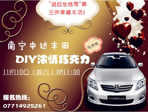 11月10日(周六)南寧中達豐田“品位生活季”第三彈之DIY濃情巧克力幸福來襲,只要提前預約,進店即可免費參與DIY巧克力制作,與您的親友分享幸福好滋味!也許給您心中的她(他)送一份心意巧克力,第二天就不用再過光棍節(jié)咯!