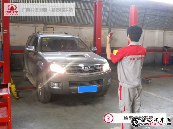 3.車輛外部功能檢查,檢查項目包括:燈光系統(tǒng)、雨刷器、倒車雷達和加油口等。