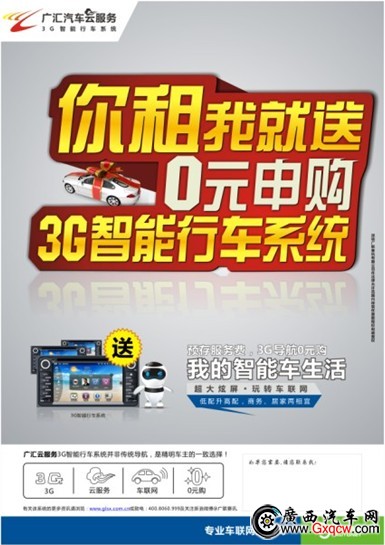 想要擁有以上全部的服務功能嗎?只要您是廣匯租賃的客戶,就可以參與本次“你租我就送,0元申購3G智能行車系統(tǒng)”活動。參加活動的車主預存一定金額的服務費即可獲贈價值8000元的3G智能導航一部以及對應時間段的車聯網服務。續(xù)費方式非常靈活,您可以根據您租賃車的時間來選擇相應的類型。