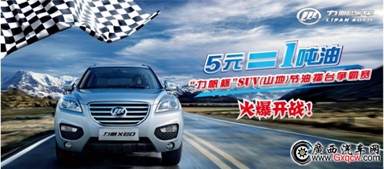 本次“力帆杯SUV山地節(jié)油擂臺(tái)爭(zhēng)霸賽南寧站”活動(dòng)由南寧市開(kāi)天汽貿(mào)易有限公司力帆4S店主辦。車(chē)型符合參賽條件的SUV用戶只需花5元錢(qián)即可報(bào)名參加。比賽共分兩個(gè)階段,即選拔賽階段和總決賽階段,其中,選拔賽分兩場(chǎng)進(jìn)行。第一場(chǎng)選拔賽于11月25日開(kāi)始,第二場(chǎng)選拔賽于12月15日開(kāi)始,兩場(chǎng)選拔賽的優(yōu)勝者將晉級(jí)總決賽?倹Q賽時(shí)間定于12月22日,最終冠軍將獲得力帆汽車(chē)提供的1噸油大獎(jiǎng)。