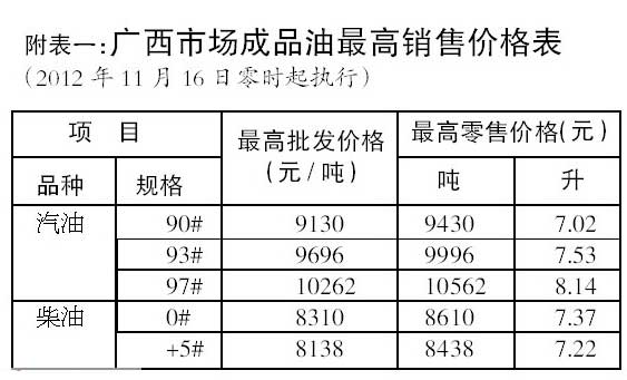 11月15日,自治區(qū)物價局下發(fā)通知,與全國同步調(diào)整成品油價格(詳見附表一)。這是年內(nèi)第8次價格調(diào)整,漲價和降價各為4次。其中,年內(nèi)成品油價格最高、漲幅最大的是3月20日,當(dāng)時,93#、97#汽油雙雙破“8”,97#汽油每升售價8.70元;93#汽油每升售價8.05元。隨后,價格又經(jīng)歷了三連降,至7月11日,93#汽油與3月最高位時的價格相比,每升售價下降了1.02元,為7.03元/升,97#汽油與最高位相比,每升售價下降了 1.10元,為7.60元。今日則是兩連漲后的再度降價,漲跌若干次,這次的油價大致回到了今年2月8日調(diào)價的水平(具體價格詳見附表二及圖示)。
