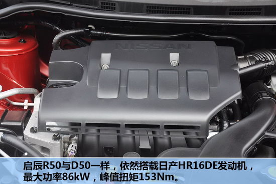 R50與D50在動力系統(tǒng)方面完全一致,1.6L發(fā)動機(jī)在原來老騏達(dá)上的HR16DE上改進(jìn)而來,最大功率提升了6kW。良好的動力性、可靠性和經(jīng)濟(jì)性都已贏得了不錯的口碑,這也為啟辰增添了又一賣點。與這臺最大功率86kW/6000rpm,最大扭矩153Nm/4400rpm的發(fā)動機(jī)匹配的是5擋手動變速箱或4擋自動變速箱。