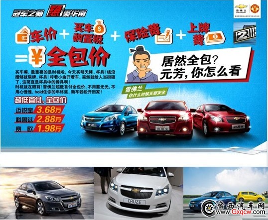 無車一族看到下面的信息更要hold住,屬于屌絲們的“華麗逆轉(zhuǎn)”已吹響征集號角!雪佛蘭即將推出新賽歐、科魯茲、邁銳寶2013款冠軍系列車型,分別以1.98萬、2.88、3.68萬“車價+買車購置稅+保險費+上牌費”的超低首付全包價傾情巨獻東盟車展。相比前面三款編輯推薦的“只可遠觀而不可褻玩”的“冠軍”車型,雪佛蘭2013款冠軍車系是唯一一款能讓廣大百姓隨心所欲就能開走的“冠軍”車型。