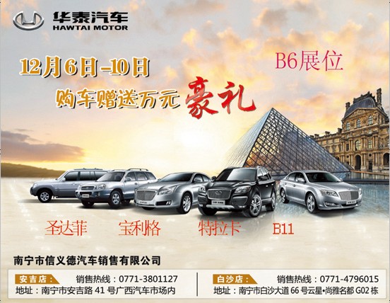 為喜迎第五屆中國-東盟(南寧)國際汽車展覽會12月6日-10日隆重舉行,南寧信義德真情回饋廣大客戶,車展期間到我公司購車可享受萬元豪禮優(yōu)惠,每日將推出兩臺寶利格特價車,蒞臨B6展位賞車購車顧客朋友即可獲贈精美禮品一份!垂詢熱線:0771-3801127 地址:南寧市安吉路41號廣西汽車市場內(nèi)。