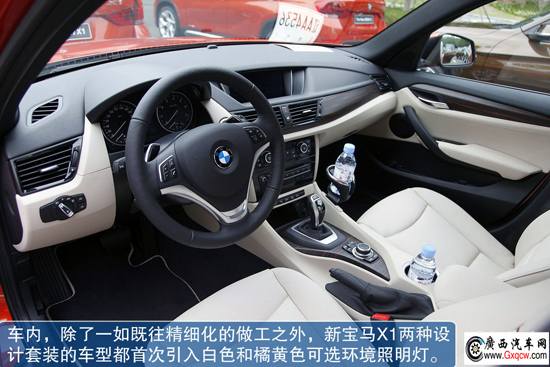 車(chē)內(nèi),除了一如既往精細(xì)化的做工之外,新寶馬X1兩種設(shè)計(jì)套裝的車(chē)型都首次引入白色和橘黃色可選環(huán)境照明燈,高檔次的產(chǎn)品定位也依然得到清晰體現(xiàn)。