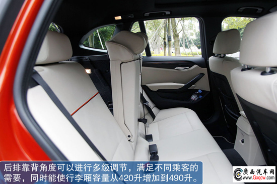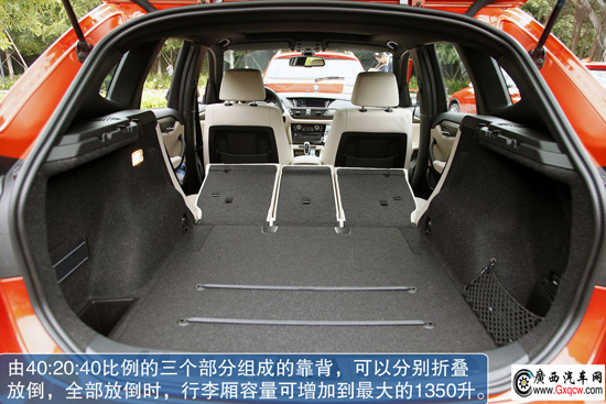 雖然X1的體積很小巧,不過(guò)在內(nèi)部空間功能性上一點(diǎn)也不含糊。與很多正規(guī)SUV一樣,它的空間使用靈活多變。后排靠背角度可以進(jìn)行多級(jí)調(diào)節(jié),滿足不同乘客的需要,同時(shí)能使行李廂容量從420升增加到490升。此外,由40:20:40比例的三個(gè)部分組成的靠背,可以分別折疊放倒,以適應(yīng)不同成員數(shù)量、不同尺寸行李物品的實(shí)際需要,后排靠背全部放倒時(shí),行李廂容量可增加到最大的1350升。