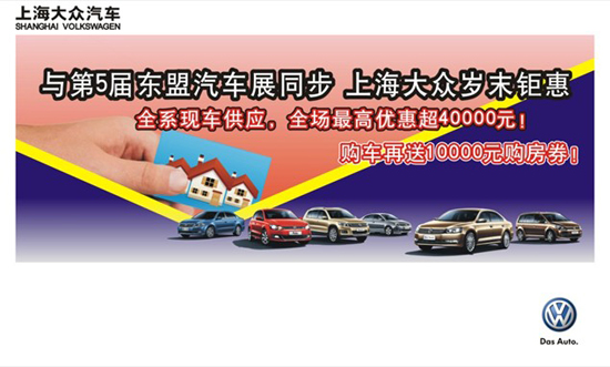 12月6日-10日,上海大眾廣西眾源攜上海大眾全系車(chē)型亮相2012第五屆中國(guó)-東盟國(guó)際汽車(chē)展13號(hào)館。車(chē)展期間親臨秀廂大道199號(hào)金源國(guó)際汽車(chē)城廣西眾源銷(xiāo)售展廳選車(chē)購(gòu)車(chē),最高尊享超4萬(wàn)元鉅惠!