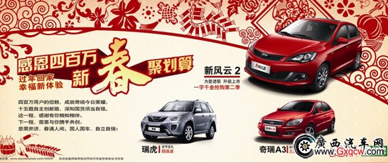 年終歲末,圣誕、新年、春節(jié)一個(gè)個(gè)溫馨浪漫、其樂融融的節(jié)日接踵而至。為慶祝奇瑞汽車全球銷量突破400萬輛,自2012年12月1日起,奇瑞汽車為感恩回饋廣大顧客,特推出“感恩四百萬 新春聚劃算”大型促銷活動(dòng)。屆時(shí),奇瑞A3也同步推出新春購車三連送活動(dòng),突破萬元的惠民禮、導(dǎo)航禮、裝飾禮件件貼心,連環(huán)相送。
