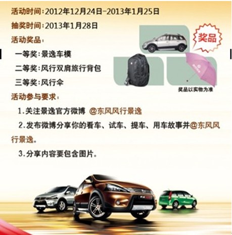 南寧坤馳風(fēng)行“好故事,逸起分享” 約惠景逸,驚喜無限,分享小故事,送驚喜大獎(jiǎng)。即刻起,只要在“好故事,逸起分享”活動(dòng)期間關(guān)注@東風(fēng)風(fēng)行景逸官方微博,并發(fā)微博@東風(fēng)風(fēng)行景逸分享你和景逸的故事,就有機(jī)會(huì)獲得景逸車模、風(fēng)行雙肩背包等多重好禮,還不行動(dòng)?