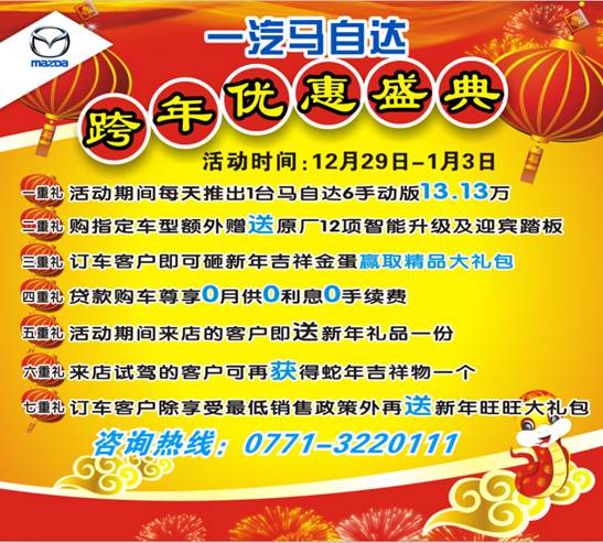 2013年新起點(diǎn) 新氣象,買(mǎi)個(gè)好車(chē)過(guò)好年。2012年29日至2013年3日鑫廣達(dá)一汽馬自達(dá)跨年優(yōu)惠盛典,13.13萬(wàn)購(gòu)馬6,優(yōu)惠引爆全城!購(gòu)指定車(chē)型增配不增價(jià),還可砸金蛋贏大禮。