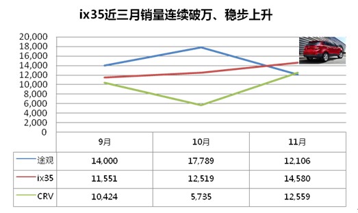 11月,北京現(xiàn)代ix35售出14,580輛,擊敗東風本田CR-V、上海大眾途觀,再次成為國內(nèi)SUV市場月銷量冠軍。這已經(jīng)是ix35連續(xù)三月銷量突破1萬輛大關。與途觀、CR-V出現(xiàn)的大幅波動不同,ix35的市場表現(xiàn)顯得十分穩(wěn)定,在進入9月后銷量一直穩(wěn)步上升,并登頂銷量榜單。與此同時,ix35的其同門兄弟途勝也在11月售出5000輛,名列榜單第六。