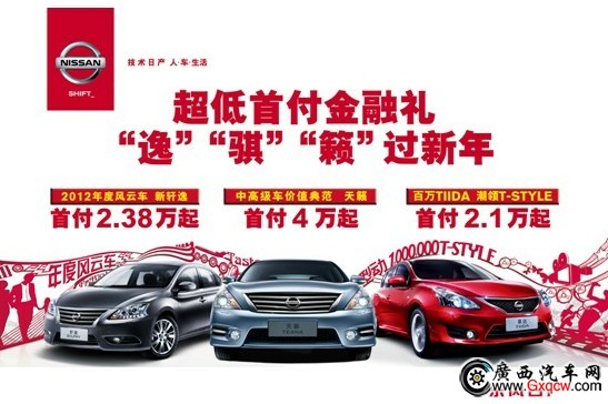 1月12日,廣緣東風(fēng)日產(chǎn)邀您“逸”“騏”“賴”過新年,就在周末,現(xiàn)車限量拋售,全車系多款車型,超低首付;首付4萬, 中高級車“舒適之王”新天籟即可開回家;“時尚之型,潮流外觀”全能跨界SUV逍客首付僅2.8萬,“2012年度風(fēng)云車”新軒逸首付僅需2.38萬。同時,現(xiàn)在購車即可享受東風(fēng)日產(chǎn)為您提供的《安全保障承諾》及《品質(zhì)無憂保障》,讓您擁有安全舒適用車生活。到店即可優(yōu)先試駕,參與試駕兩款車型,還有機會獲得精美禮品一份。