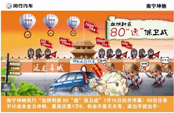 南寧坤馳 “血拼到底!風(fēng)行汽車80“逸”保衛(wèi)戰(zhàn)”1月15日拉開序幕!80臺任務(wù)全力沖刺,將優(yōu)惠血拼到底,最高優(yōu)惠1萬6(限量),機(jī)會不是天天有,該出手就出手!周末到店參與活動(dòng),更有機(jī)會贏取延龍汽車城“金玉滿堂”至尊豪禮,同時(shí)還有菱智商務(wù)版車型送IPHONE5活動(dòng),詳詢南寧坤馳0771—5688996。