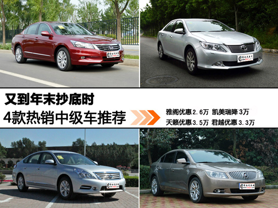 隨著時代的發(fā)展,購車群體日漸年輕化,在注重性能之余,也更加關(guān)注車身整體的美觀。2012年的腳步已幾近尾聲,各大廠商都在打著優(yōu)惠促銷的招牌,商家的優(yōu)惠力度也非常之大。在這樣轟轟烈烈的年底購車時,對于中級車市場來說,無疑是消費者最關(guān)注的,那么究竟哪款車更熱銷?哪款車更容易打動消費者的心?我們今天為大家挑選了目前市場上優(yōu)惠較大的幾款熱銷中級車,也許其中就有您心儀的那一臺!