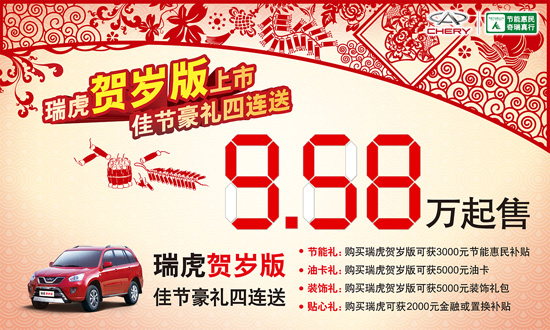 2012不是終結(jié),2013精彩繼續(xù)。為迎接癸巳蛇年到來,即日起,奇瑞經(jīng)銷商隆重推出瑞虎賀歲版車型,新增以一體化前保險(xiǎn)杠、側(cè)門踏板及DVD導(dǎo)航,最低9.58萬元起售。活動期間,凡購買瑞虎賀歲版即可獲得“佳節(jié)好禮四連送”,享受最高15000元超值鉅惠。