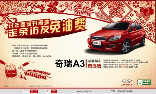 年終歲末,值此新春佳節(jié)之季,奇瑞A3購車優(yōu)惠更“給力”,“過年回家開奇瑞.走親訪友免油費—購奇瑞A3四重豪禮相贈”優(yōu)惠購車活動火暴進行中。