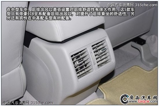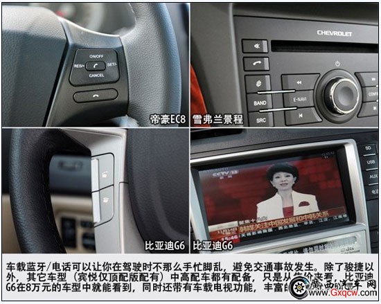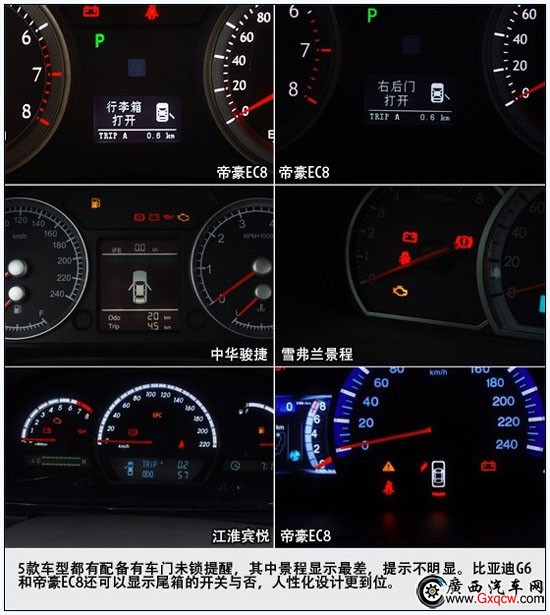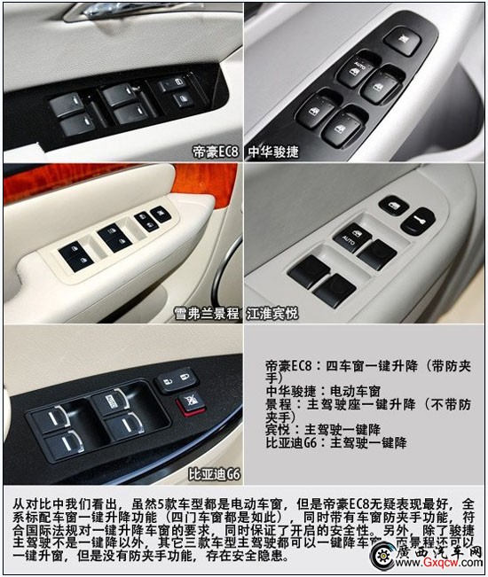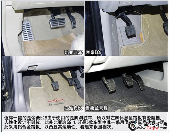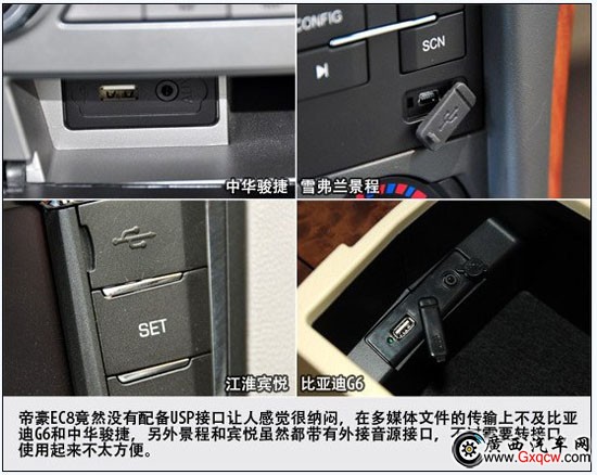 小結(jié):從以上的對比中可以看出,帝豪EC8和比亞迪G6在人性化設(shè)計方面領(lǐng)先于其它車型,配置豐富,并且細(xì)致周到,人性化體驗較好。而景程和賓悅雖然也能達(dá)到這樣的水平,但是卻要花費更多的銀子。
