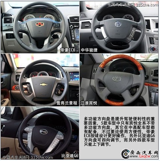 我們對比的5款車型由于售價的高低之分,在人性化配置以及舒適性上會有些不同。但是對于一些通用型的設(shè)計上還是可以看出各自廠商之間的差異。吉利帝豪確實是自主品牌中推出高端子品牌最成功的一個,帝豪EC7一直是自主品牌中最熱銷的緊湊級車,而這次帝豪EC8在各方面的表現(xiàn)中也非常突出。比亞迪G6是以豐富的配置而聞名,在性價比上是其它車型不可匹敵的。賓悅和景程在這些方面就要稍差一籌,優(yōu)勢并不突出。另外中華駿捷雖然各方面表現(xiàn)很差,但是它的最大優(yōu)點是售價較低,7萬左右的售價就可以買到一款中型車,何樂而不為呢。