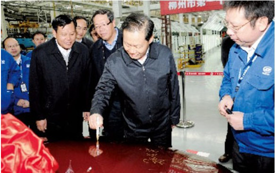 就在同一天,新上任的廣西壯族自治區(qū)黨委書記彭清華,在柳州市委書記陳剛等的陪同下到公司視察。彭清華一行先后參觀了公司總部和剛建成投產(chǎn)的寶駿基地。在聽取沈陽總經(jīng)理對公司生產(chǎn)經(jīng)營情況的介紹后,彭書記對公司合資十年來所取得的成績給于了高度贊揚,他鼓勵公司抓住黨的十八大強調(diào)“擴大內(nèi)需”等發(fā)展機遇,強化創(chuàng)新驅(qū)動,實現(xiàn)企業(yè)自身的發(fā)展的同時為廣西汽車工業(yè)的發(fā)展做出更大的 貢獻。