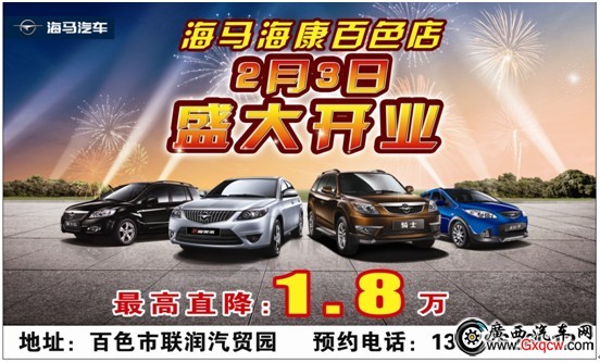 廣西海馬?蛋偕陮⒂2月3日在百色市聯(lián)潤汽貿(mào)園盛大開業(yè)。海馬汽車全系車型將悉數(shù)登場,抄底震撼等您來,最高直降1.8萬元優(yōu)惠。您還等什么,趕緊行動吧。您只需要通過網(wǎng)絡報名 或 “報名熱線”:13978626912 報名就可獲精美禮品一份。