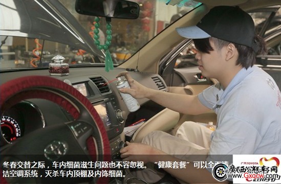 此外,春節(jié)期間隨著車主的用車頻率大大增高,也給愛車的性能提出了更要的要求。面子重要,里子更重要!怎樣才能讓愛車開起來“有里有面”?為了滿足愛車多元化的保養(yǎng)需求,廣汽豐田南寧廣緣高新區(qū)店店推出了專業(yè)養(yǎng)護(hù)套餐促銷活動,包括養(yǎng)心套餐、動力套餐和健康套餐!梆B(yǎng)心套餐”針對冬季發(fā)動機(jī)易發(fā)生啟動困難的問題,保養(yǎng)車輛的心臟發(fā)動機(jī),讓它保持強(qiáng)勁穩(wěn)定的動力,該套餐既有清潔保護(hù)的作用,還有耐磨抗壓的功能。如果長途行駛后的車主發(fā)覺愛車加速不良,“動力套餐”則能夠徹底溶解剝離臟物,保護(hù)和潤滑燃油系統(tǒng)。而在冬春交替之際,車內(nèi)細(xì)菌滋生問題也不容忽視!敖】堤撞汀笨梢匀媲鍧嵖照{(diào)系統(tǒng),滅殺車內(nèi)頂棚及內(nèi)飾細(xì)菌。