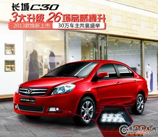 長(zhǎng)城汽車(chē)旗下的明星家轎——2013款長(zhǎng)城C30炫亮升級(jí) 紅動(dòng)上市,售價(jià)為6.45—8.35萬(wàn)元,享受?chē)?guó)家3000元節(jié)能惠民補(bǔ)貼,增值不增價(jià)。2013款長(zhǎng)城C30保持了固有的“低油耗、大空間、歐洲品質(zhì)、五星安全、超長(zhǎng)保修”等優(yōu)勢(shì),在繼承了原有車(chē)型全方位領(lǐng)先優(yōu)勢(shì)的基礎(chǔ)上,在外觀、內(nèi)飾、品質(zhì)進(jìn)行3大升級(jí)、26項(xiàng)品質(zhì)提升,提供舒適型、豪華型、精英型3款車(chē)型,搭載手動(dòng)和CVT變速器。為消費(fèi)者提供了一款兼具品質(zhì)與安全的轎車(chē)。享受4年或15萬(wàn)公里超長(zhǎng)質(zhì)保,并提供4次免費(fèi)保養(yǎng),使消費(fèi)者用車(chē)省心、安心。