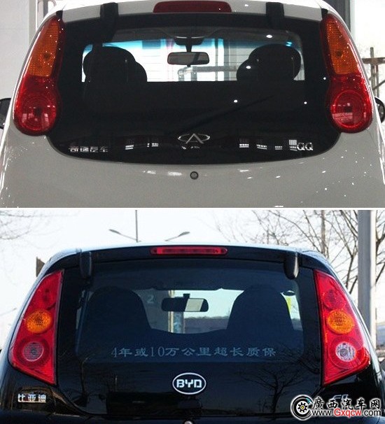 比亞迪F0與新QQ的尾巴很像,如果沒有任何標識,還真看不出誰是誰。新QQ的尾部裝備了兩個倒車雷達,比較厚道,增加了泊車時的便利性。比亞迪F0沒有裝備倒車雷達,這點做的不如新QQ。