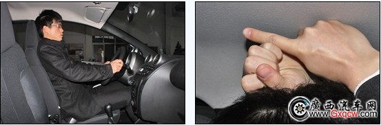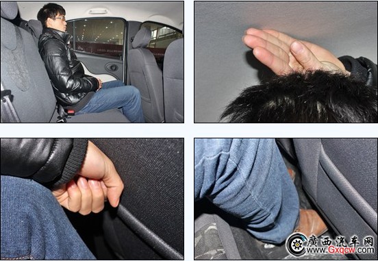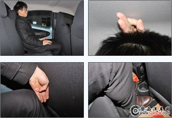 同樣是178公分的人體驗(yàn)比亞迪F0,在調(diào)整好座椅后,前排頭部和新QQ一樣,也是一拳+一指的剩余,但是后排表現(xiàn)就不如新QQ了,頭部只有兩指的剩余,腿部也不到一拳(四指)。