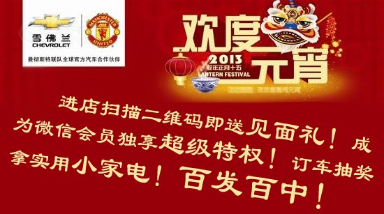 2月23、24日廣西榮通雪佛蘭元宵節(jié)奉“春天禮” 榮通誠邀您到民樂路14號(hào)來,將您心儀的車型帶回家過團(tuán)圓節(jié),進(jìn)店掃描官方二維碼即送見面禮!就可成為微信會(huì)員獨(dú)享超級(jí)特權(quán)!