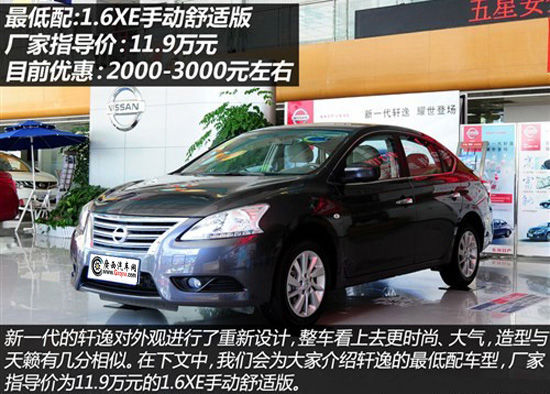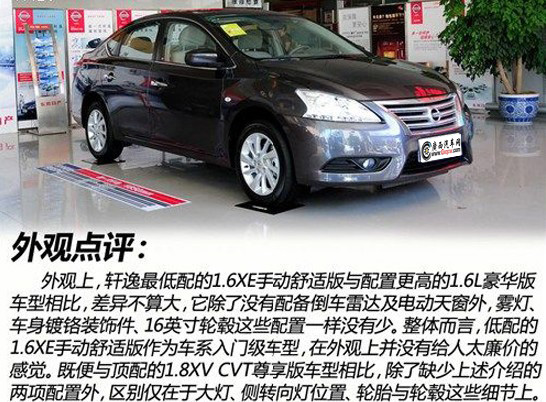 軒逸一直以舒適和空間見長,于2012年7月上市的全新一代車型,在發(fā)動(dòng)機(jī)、變速箱、外觀、內(nèi)飾等方面相對(duì)上一代車型都有所提升。據(jù)資料顯示,它的1.6L排量車型在2012年12月份的全國銷量就有11726臺(tái),可見消費(fèi)者對(duì)它的認(rèn)可度還是不錯(cuò)的。今天,我們給大家?guī)砹塑幰葑畋阋塑囆汀蹆r(jià)為11.9萬元的1.6XE手動(dòng)舒適版實(shí)拍,并通過它與配置更高車型的比較,介紹這款低配車型是否值得大家購買。