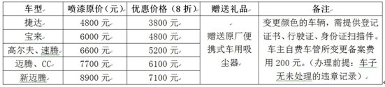 ● 免費(fèi)代辦車(chē)管所車(chē)輛顏色變更備案一條龍服務(wù)。 各車(chē)型全車(chē)噴漆價(jià)格明細(xì):