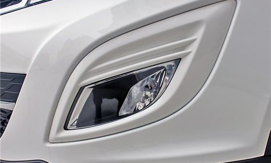 前臉部分,大燈設計十分兇悍,下保險杠和霧燈看上去充滿精神,霧燈造型設計很顯眼,柳葉狀看起來很有創(chuàng)意。采用LED日間行車燈和氙氣大燈顯得都很厚道,值得表揚。