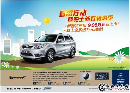 小編從海馬?4S店獲悉,東興車(chē)展會(huì)將在2013年3月8日-10日在東興體育場(chǎng)前廣場(chǎng)隆重舉行。屆時(shí)海馬騎士新春特惠版SUV與福美來(lái)冠軍版將在活動(dòng)期間亮相,騎士特惠版突破10萬(wàn)元大關(guān),其他車(chē)系最高優(yōu)惠1.3萬(wàn)元,還有更多優(yōu)惠等您來(lái)!歡迎廣大消費(fèi)者前來(lái)參觀。