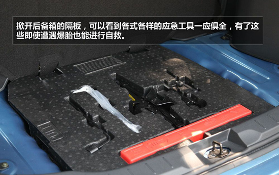 而打開后備箱下方的隔板后,歐力威同樣為我們帶來了驚喜,常用的應(yīng)急工具一應(yīng)俱全,并且在這個(gè)隔板下方,還隱藏著一條全尺寸的備胎,雖然樣式與原車不同,但已經(jīng)非常實(shí)用了。