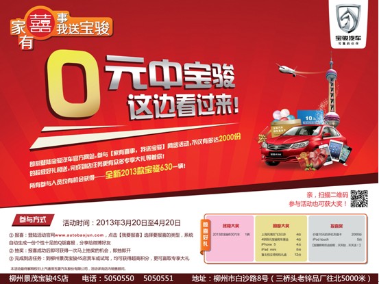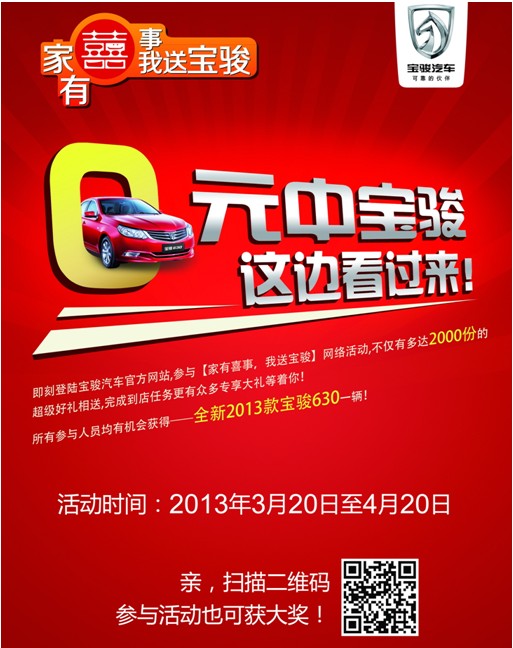 家有喜事精神爽,寶駿為您錦上添花送豪禮。“家有喜事,我送寶駿”第二季購(gòu)車(chē)優(yōu)惠活動(dòng)春季重磅來(lái)襲!即日起登陸寶駿汽車(chē)官方網(wǎng)站,關(guān)注“家有喜事,我送寶駿”活動(dòng)。獎(jiǎng)品多多送不停,寶駿汽車(chē)等你贏。
