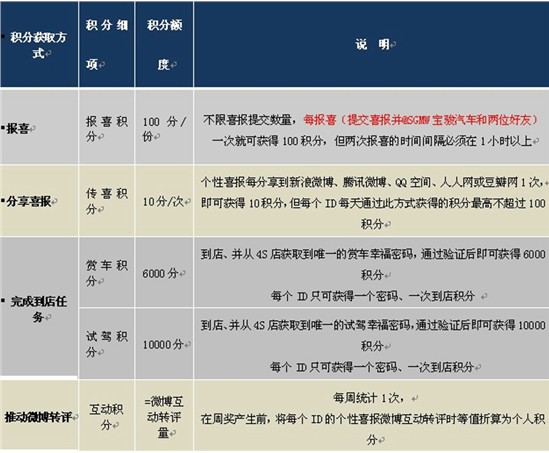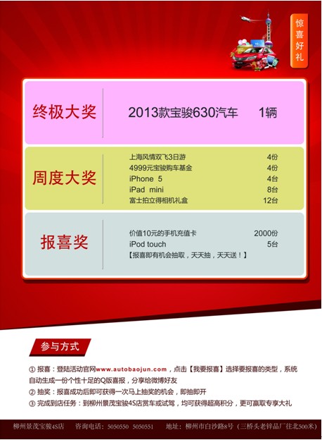 活動(dòng)一:在活動(dòng)期間登陸寶駿汽車(chē)官方網(wǎng)站,用戶(hù)可以使用“新浪微博”和“騰訊微博”帳號(hào)登陸,勾選“報(bào)喜”類(lèi)型并點(diǎn)擊“確認(rèn)”,點(diǎn)擊“提交”完成報(bào)喜提交,點(diǎn)擊“馬上抽獎(jiǎng)”便可參與即時(shí)抽獎(jiǎng)活動(dòng);多次重復(fù)完成活動(dòng)一也可參加抽獎(jiǎng)活動(dòng),同一ID可多次報(bào)喜,兩次報(bào)喜之間時(shí)間間隔不少于1小時(shí);同一ID一天之內(nèi)可能有多次抽獎(jiǎng)機(jī)會(huì)(如當(dāng)天還未中過(guò)獎(jiǎng),報(bào)喜成功即可抽獎(jiǎng)),但只有一次中獎(jiǎng)機(jī)會(huì);點(diǎn)擊“我的報(bào)喜”,選擇微博賬號(hào)登陸,進(jìn)入后選擇想要分享的喜報(bào),點(diǎn)擊“一鍵分享”,勾選想要分享到的社交平臺(tái),按照提示“登陸”后完成即可;