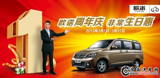 (廣西汽車網(wǎng) 訊)近日,編輯從南百汽車長(zhǎng)安店了解到,3月30日店內(nèi)舉行歐諾周年慶團(tuán)購會(huì),驚喜連連。近期欲購長(zhǎng)安歐諾車型的朋友不訪到店了解或電話咨詢。具體優(yōu)惠活動(dòng)如下: