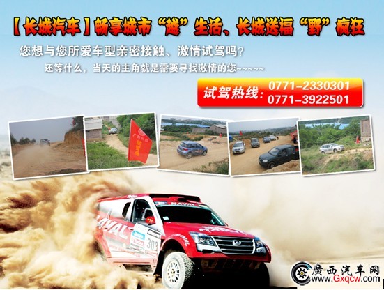 長(zhǎng)城汽車(chē)2013達(dá)喀爾拉力賽依舊表現(xiàn)強(qiáng)勁,追平歷史最佳水平,達(dá)喀爾這個(gè)魔鬼賽場(chǎng)充分見(jiàn)證了長(zhǎng)城汽車(chē)的越野品質(zhì)!為祝賀長(zhǎng)城汽車(chē)在達(dá)喀爾賽場(chǎng)上的優(yōu)異表現(xiàn),廣西長(zhǎng)道旗下白沙4S旗艦店(已正式試業(yè))、安吉4S店、安吉直營(yíng)展廳統(tǒng)一聯(lián)合舉辦“暢享城市‘越’生活、長(zhǎng)城送福‘野’瘋狂”,向達(dá)喀爾致敬“野外專(zhuān)場(chǎng)試駕會(huì)”!