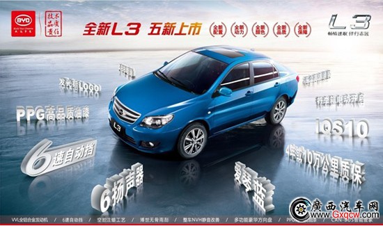 比亞迪本著以用戶需求為導(dǎo)向的原則,趁勢推出了全新L3,并進(jìn)行了“五新”升級:最大的亮點是其全新動力,搭載了自主研發(fā)的6速自動變速器,將解放駕駛者的左腳與右手,更輕松的駕駛模式、無間斷的動力輸出、換擋時間小于0.2等將全面提升了駕駛的愉悅感。還增加了全新配置,如:行李箱電動開啟功能,將給用戶帶來更多便利;發(fā)光后LOGO,則讓夜間行車更動感;6揚(yáng)聲器系統(tǒng),將進(jìn)一步豐富用戶的旅途生活。并且根據(jù)用戶要求還增加全新顏色,速銳的主打車身顏色---愛琴藍(lán)。品質(zhì)上也有進(jìn)一步提升,采用 PPG高品質(zhì)油漆,在全封閉無塵化高度潔凈涂裝環(huán)境下進(jìn)行,并用進(jìn)口ABB-IRC5P最新一代噴涂機(jī)器人及控制系統(tǒng),確保更好的漆面效果。提供4年或10萬公里超長質(zhì)保服務(wù),零部件覆蓋率更是高達(dá)99.9%,將給用戶帶來更多保障和實惠。