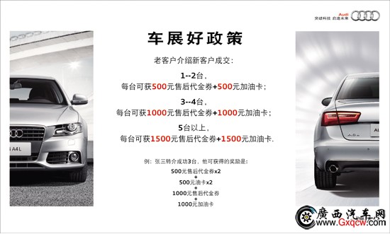 4月11日至4月14日第十屆北部灣車展期間,廣西鉅榮奧迪H7展位再掀優(yōu)惠狂潮!老客戶介紹新客戶成交,即有超級(jí)大禮相送。ㄔ撜邇H限于車展活動(dòng)期間,且客戶定金不少于5萬元,提供老客戶行駛證)