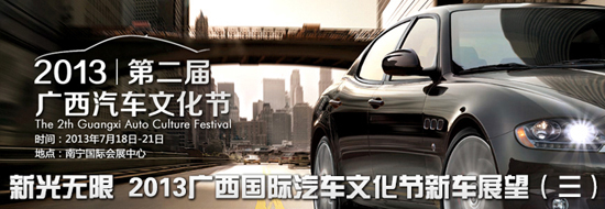 2013第二屆廣西國際汽車文化節(jié)將于7月18日-21日在南寧國際會展中心舉行。本屆汽車文化節(jié)將匯集豪華品牌、進口品牌、合資品牌及國產(chǎn)自主品牌等主流品牌入駐。7月廣西國際汽車文化節(jié)必將成為上半年所發(fā)布的新車集中展示秀臺。本次車展還將為上半年上市新車特別設(shè)立新光大道活動。